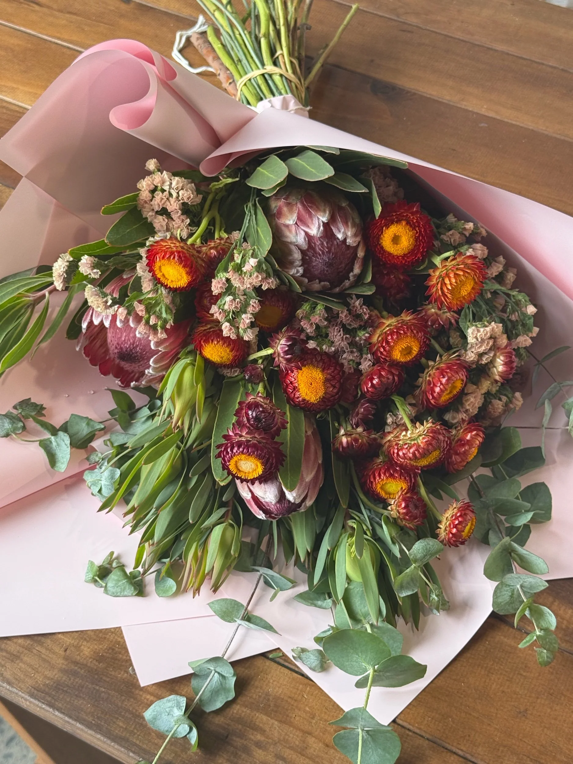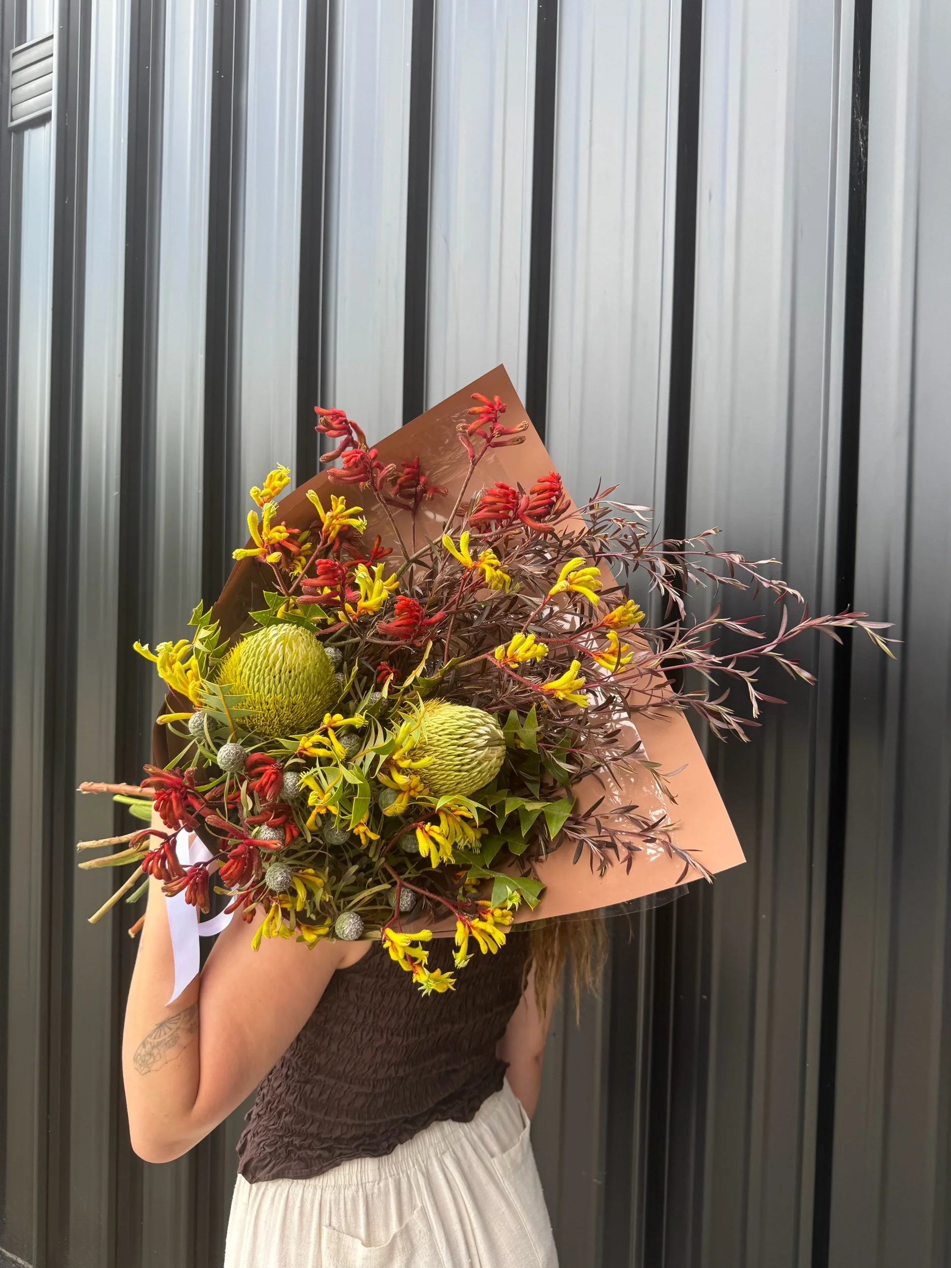 Our Native Bouquet showcases a curated selection of Australian native blooms and foliage, chosen for their texture, colour, and exceptional longevity. Thoughtfully arranged and beautifully wrapped, this bouquet is perfect for those who love something a little more relaxed and long-lasting.